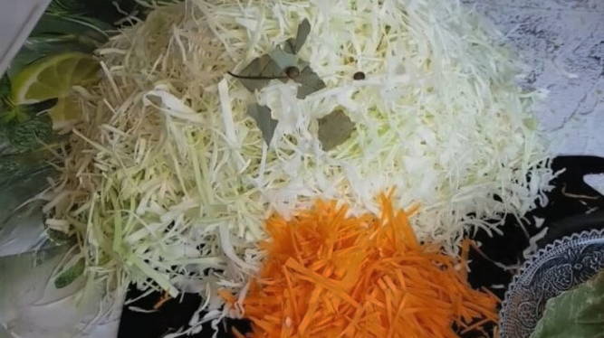 - Combineer alle gesneden groenten samen, voeg zout, kruiden, laurierblaadjes toe en plet de kool tot de kool het sap laat ontsnappen.