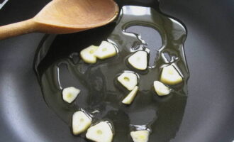 Snijd de knoflook in dunne plakjes en bak ze licht aan in een pan.