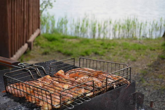 - Bak op kolen, maar niet boven een open vuur, aan elke kant gedurende niet meer dan 3-5 minuten. Het is belangrijk om niet te veel te belichten, anders komen de zeevruchten er droog uit. Serveer met een schijfje citroen en bestrooi eventueel met hete peper.