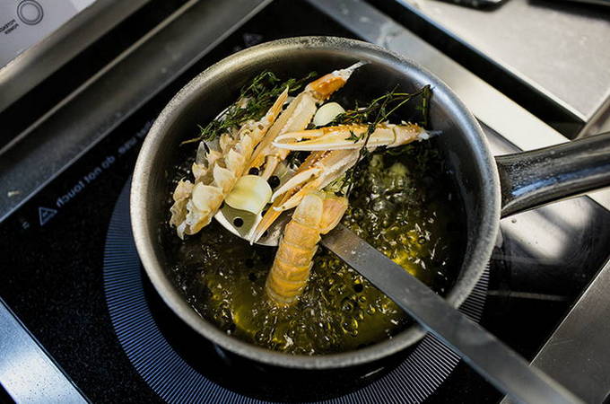 - Kook ze een paar minuten op laag vuur en haal ze er meteen uit. Het is belangrijk om de langoustines niet te veel bloot te stellen, zodat ze niet rubberachtig worden.