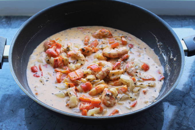- Giet room, gehakte paprika bij zeevruchten en breng op smaak met zout en gemalen peper.