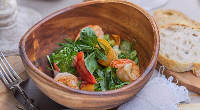 Een lichte salade met groenten en garnalen zal je snel vullen en komt je gezondheid en vorm alleen maar ten goede. Langoustines in honing en een dressing van olijfolie en citroensap geven de snack een rijke smaak.