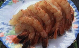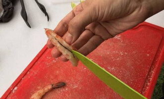 - Met onze handen of met een pincet extraheren we de zwarte strepen - de slokdarm. Dit verwijdert de extra bitterheid van het afgewerkte gerecht.