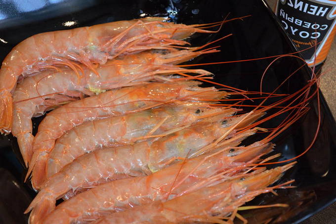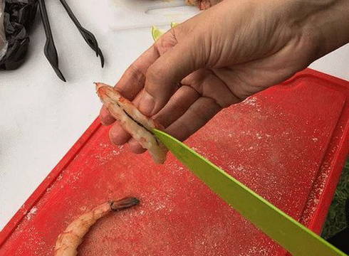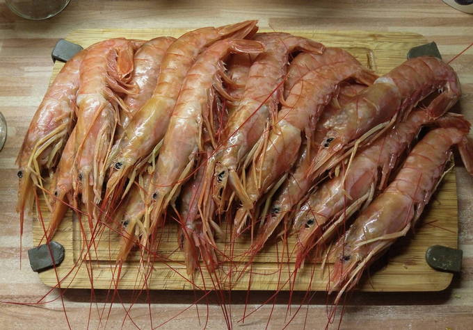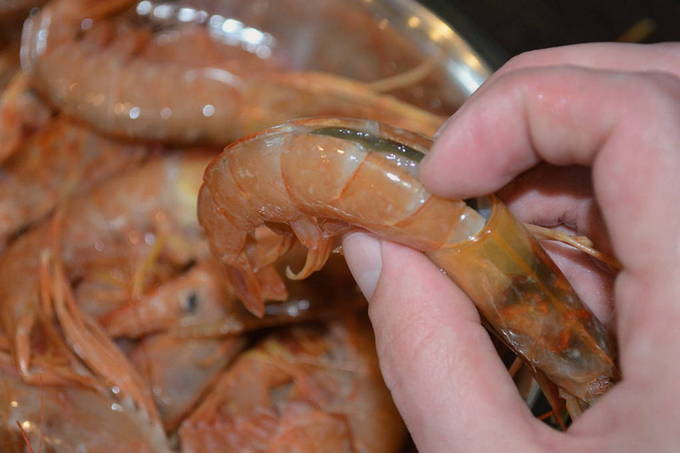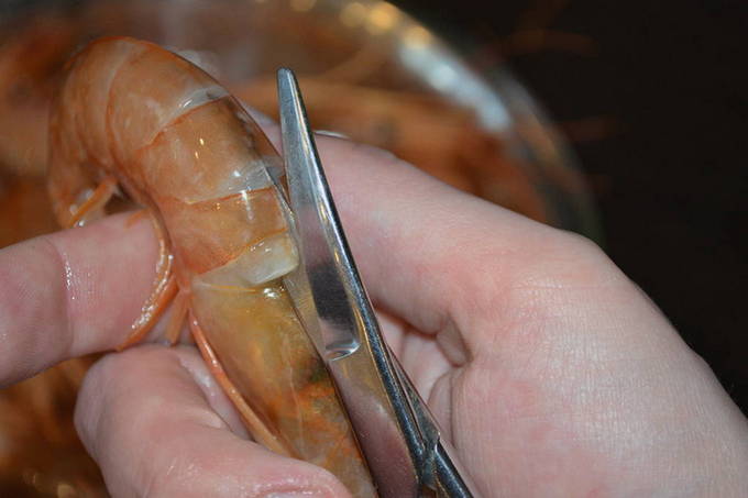 - We ontdooien de langoustines, spoelen ze af onder water en maken een klein sneetje op hun rug.
