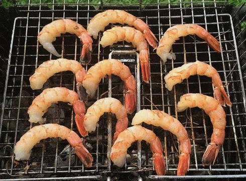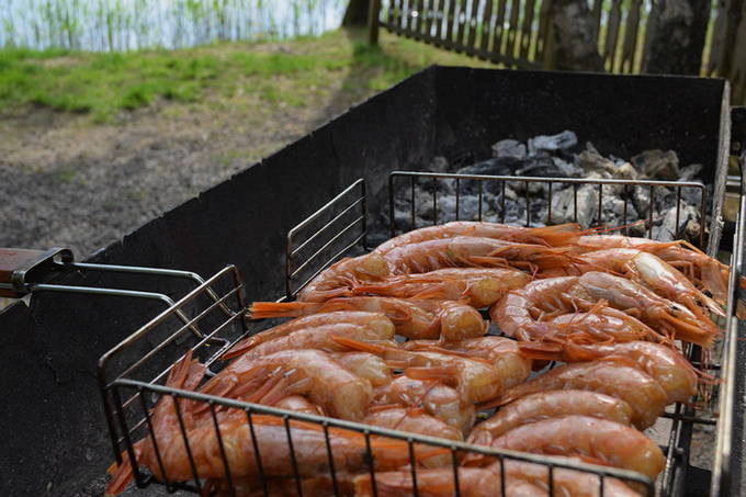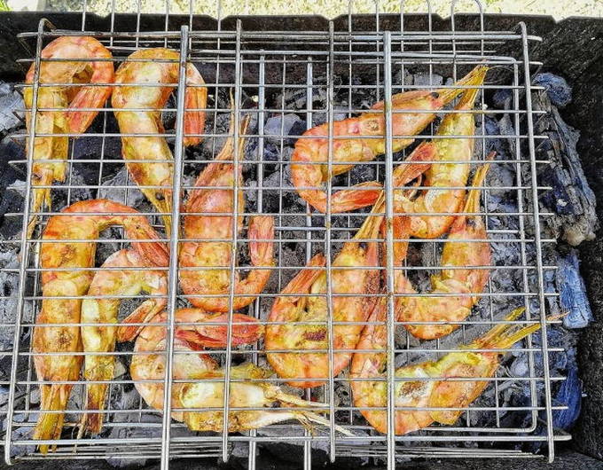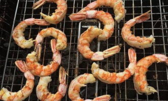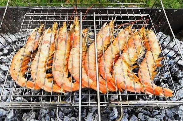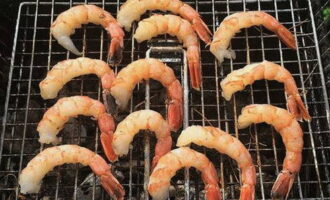 - We schuiven de langoustines naar het rooster. We plaatsen het boven de grill met hete kolen. We koken ongeveer 5-7 minuten.