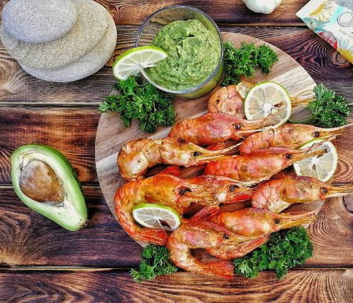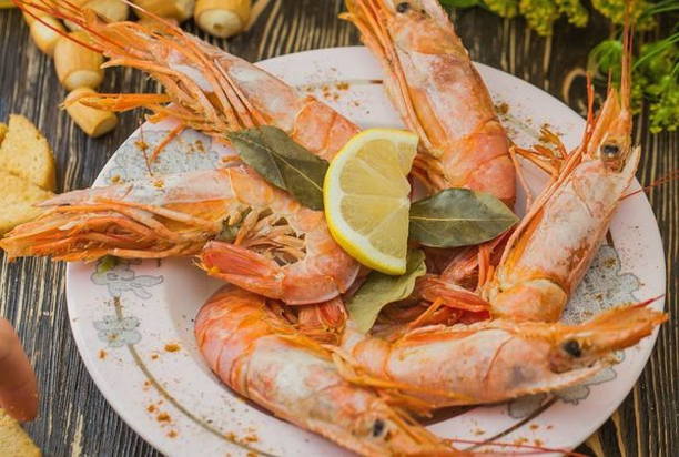 - Geurige en rossige langoustines zijn klaar. We zetten ze op borden, partjes citroen erbij en serveren!
