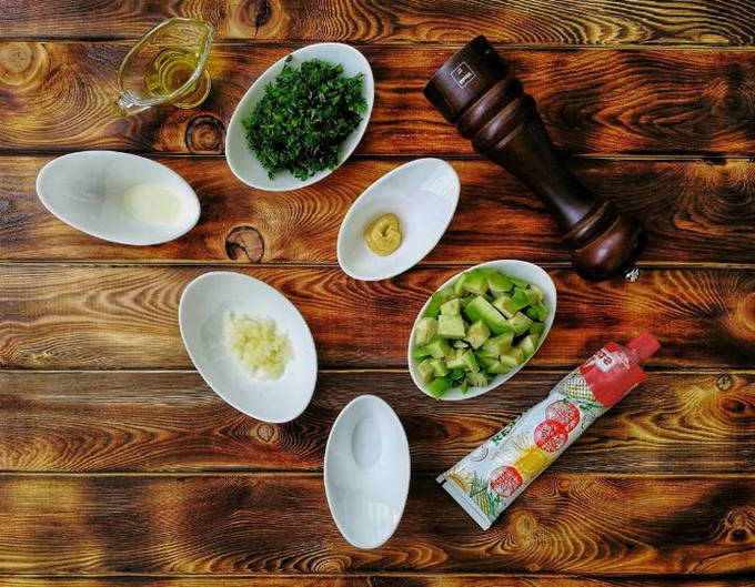 - Op dit moment kun je een saus maken om te serveren met avocado en kruiden. We zullen de nodige producten klaarmaken.