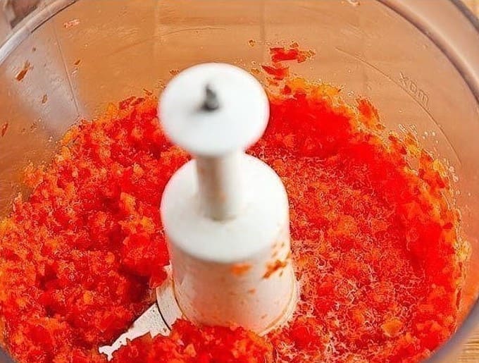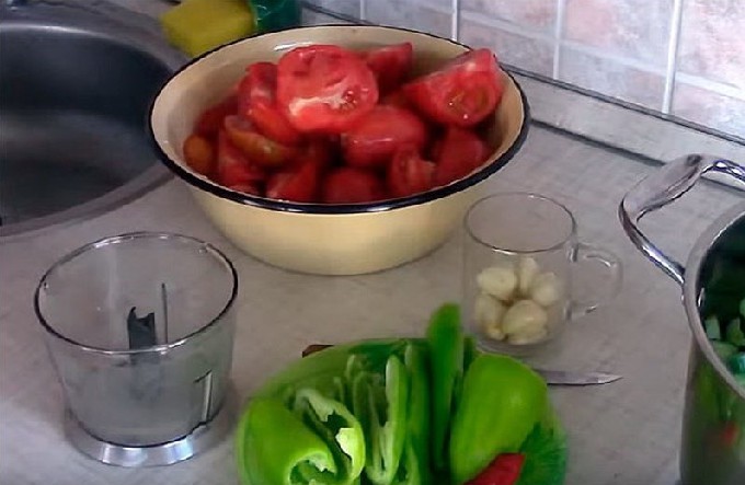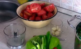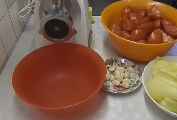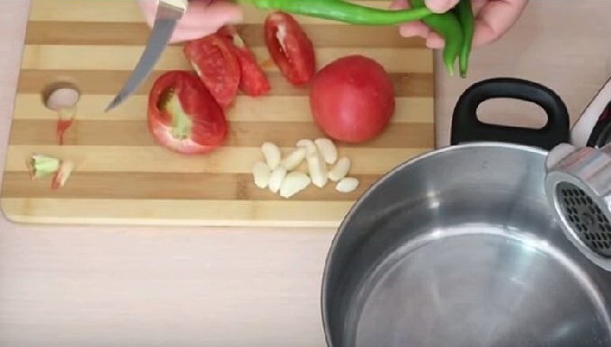 - Schil de steeltjes en zaadjes van de paprika's, spoel ze af en snijd ze in middelgrote stukken. Pel de knoflookbol. Draai deze groenten in een vleesmolen of hak ze fijn in een blenderkom.