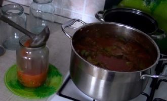 - Haal de pot met lecho van het vuur en doe de groentemassa in schone potten. U hoeft de potten niet te steriliseren, u hoeft alleen de naaddeksels te verbranden met kokend water.