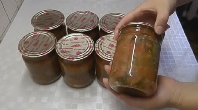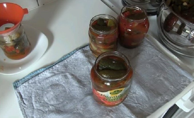 - Giet de voorbereide lecho in steriele potten en sluit af met gekookte deksels. Koel de potten ondersteboven. Niet afdekken met een deken zodat de komkommers krokant worden.
