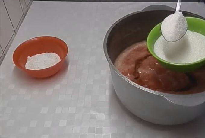 - Giet de resulterende groentepuree in een kookpan, voeg de hoeveelheid zout en suiker toe die in het recept wordt aangegeven en meng.