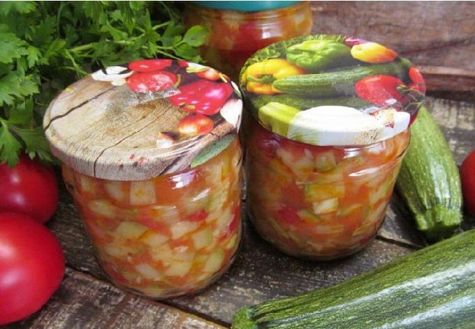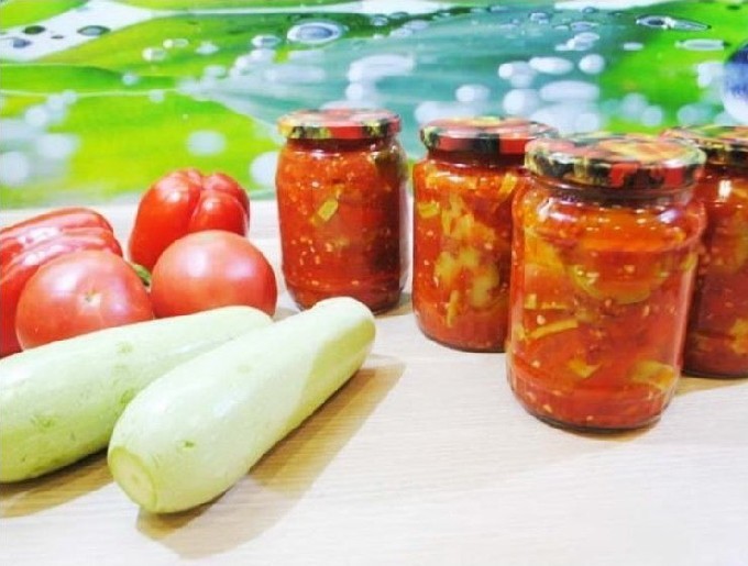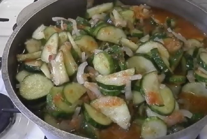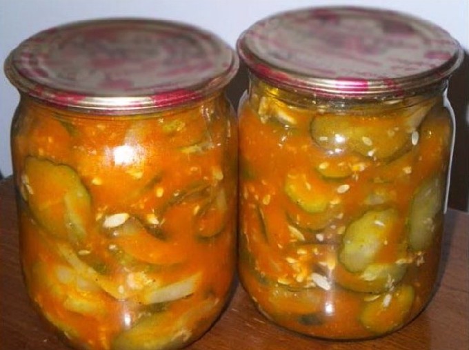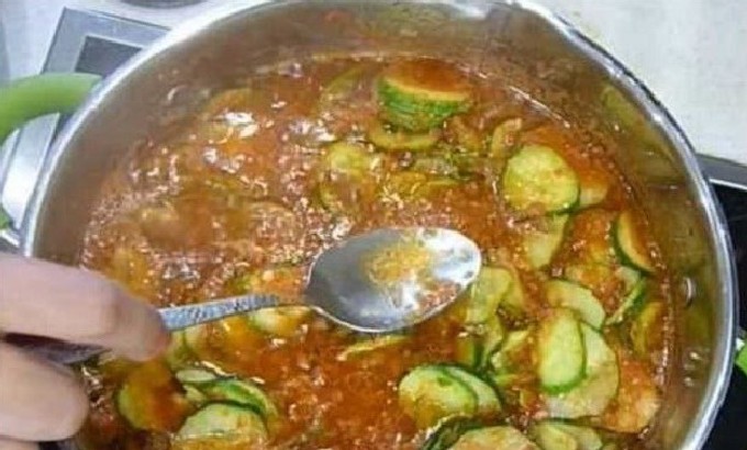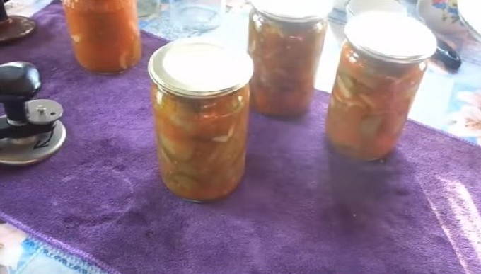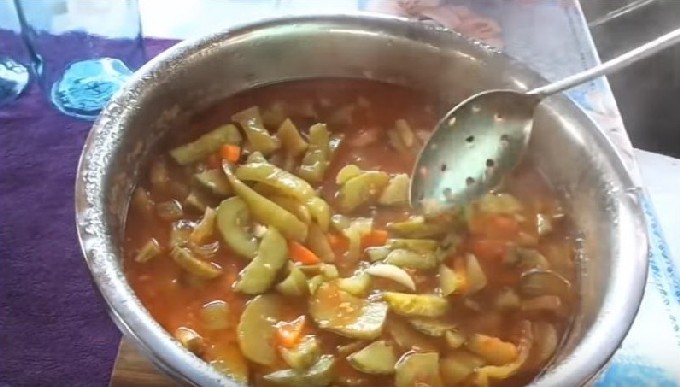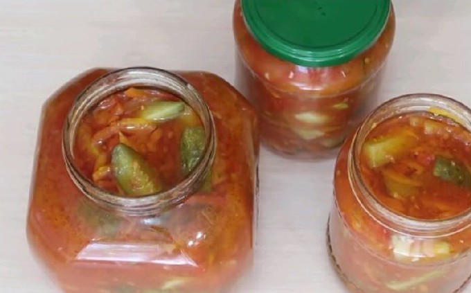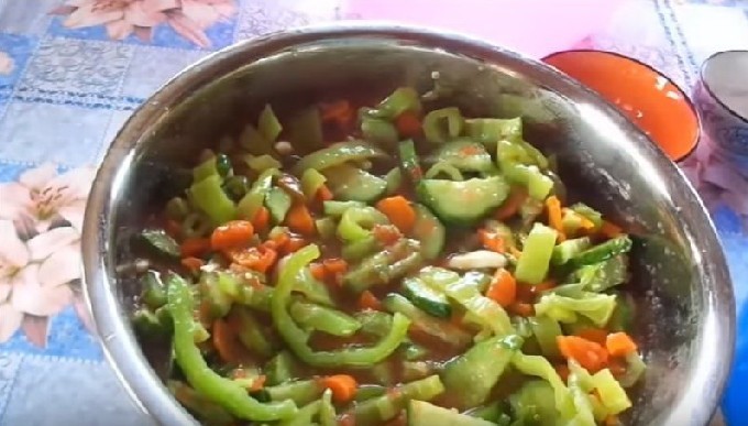 Van een verscheidenheid aan komkommer- en courgettesalades, krijg je een interessant recept voor deze heerlijke lecho. Voeg er wortelen en verse tomaten aan toe. Koken met tomatenpuree.