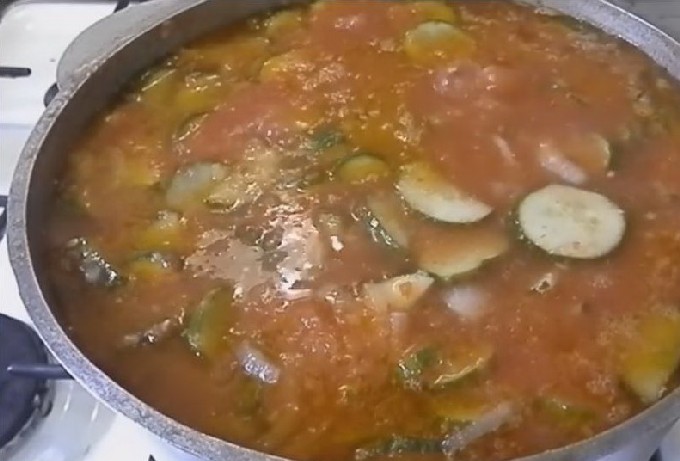- Plaats de container met groenten op middelhoog vuur en kook gedurende 15-20 minuten. Voeg vervolgens azijn toe en laat nog 2-3 minuten sudderen met gesloten deksel.
