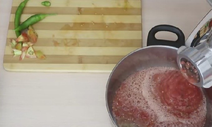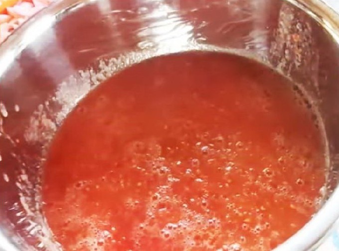 - Draai de tomaten in een vleesmolen of in een blenderkom tot een gladde massa. Schenk de tomatenpuree in een lecho-stoofschotel.