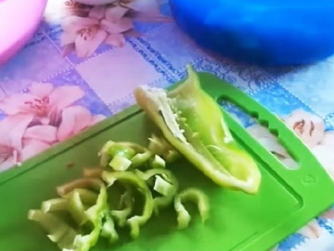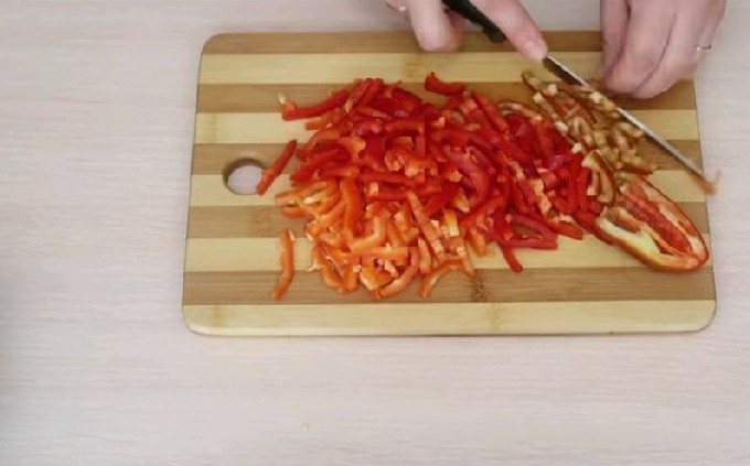 - Snijd de paprika in dunne reepjes.