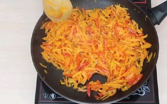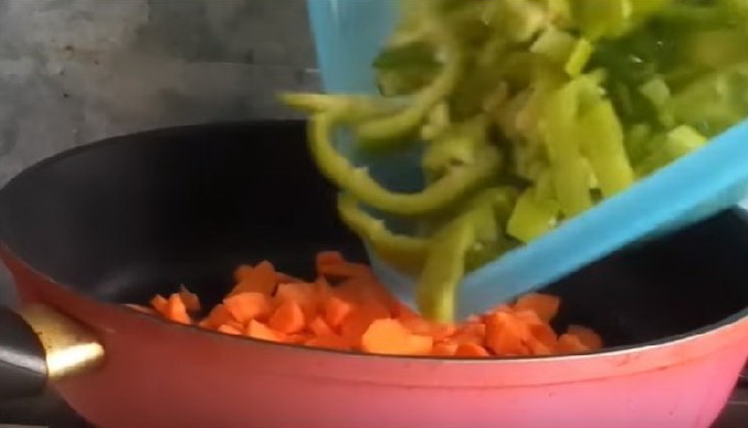 - Bak de wortelstukjes in een koekenpan met hete olie en voeg dan de gesneden paprika toe. Rooster deze groenten 10 minuten op laag vuur en vergeet niet af en toe te roeren.