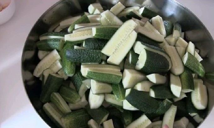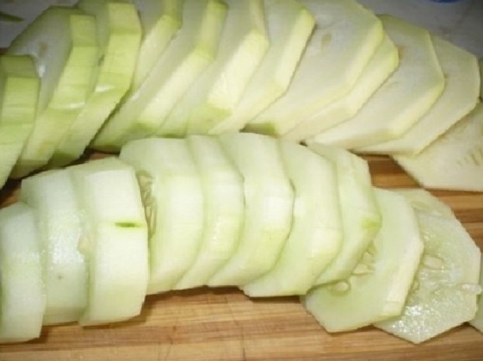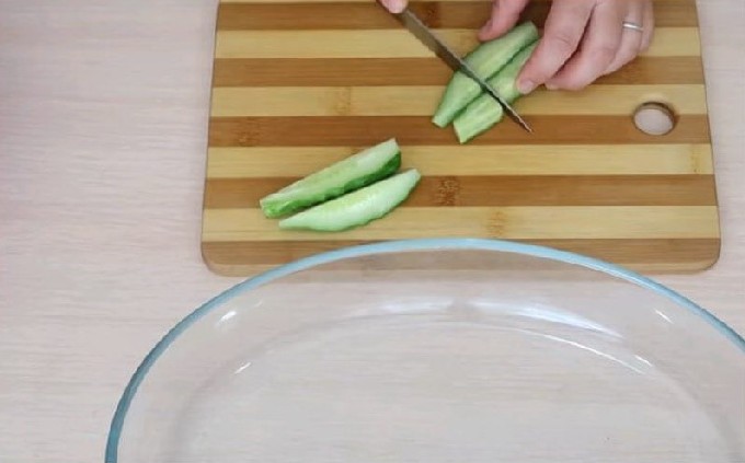 - Spoel de komkommers daarna goed af, grote vruchten kunnen worden geschild. Snijd de komkommers in schijfjes of halve cirkels (afhankelijk van de grootte) en doe ze in een stoofschotel.