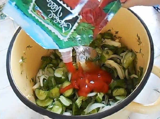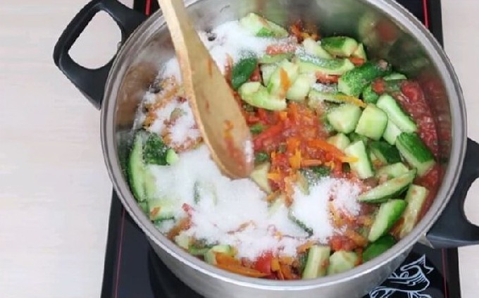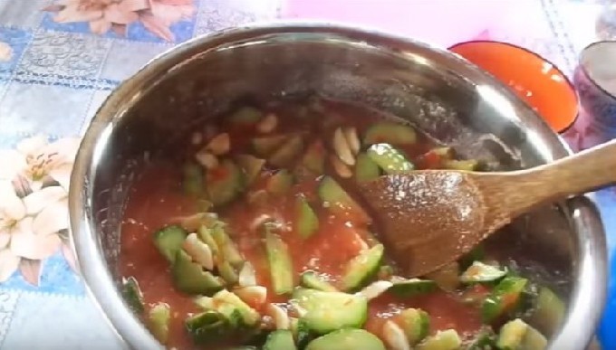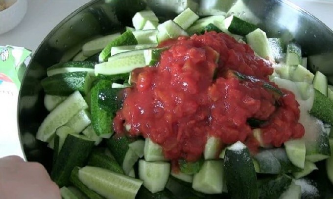 - Doe de gesneden komkommers in een bak met tomatenpuree en doe de gebakken paprika en wortel erin. Voeg aan dit mengsel de hoeveelheid zout (bij voorkeur steen), suiker zoals aangegeven in het recept toe en schenk er een half glas olie bij.