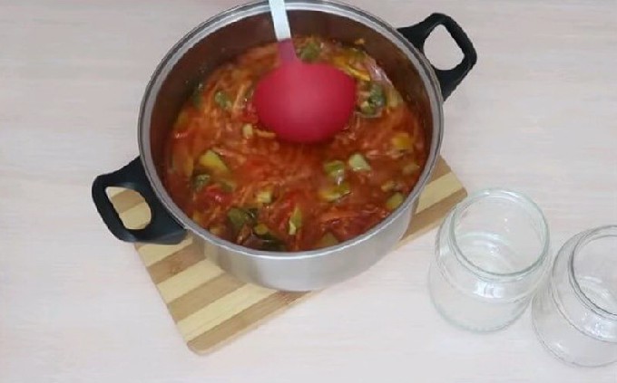 - Giet de voorbereide lecho in steriele potten en rol op. Koel de potten ondersteboven en onder een warme deken en breng ze over naar de opslag.