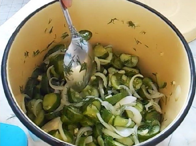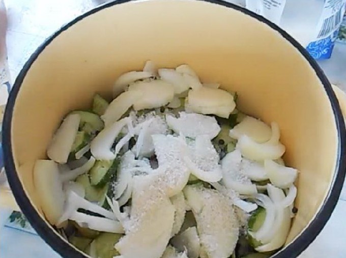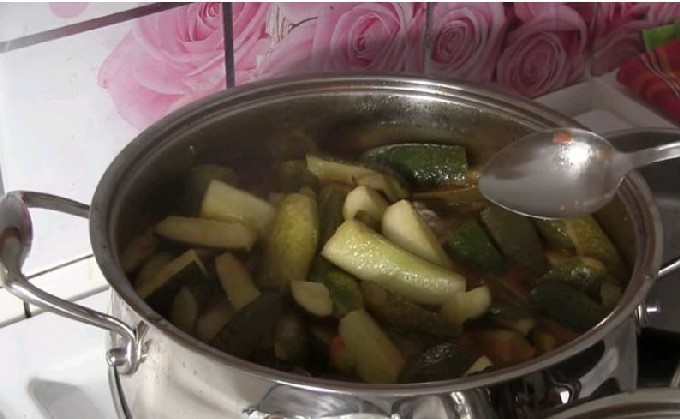 - Zet de gerechten met komkommers op middelhoog vuur, breng aan de kook en laat 20 minuten op laag vuur sudderen.