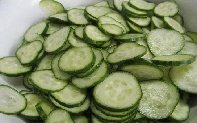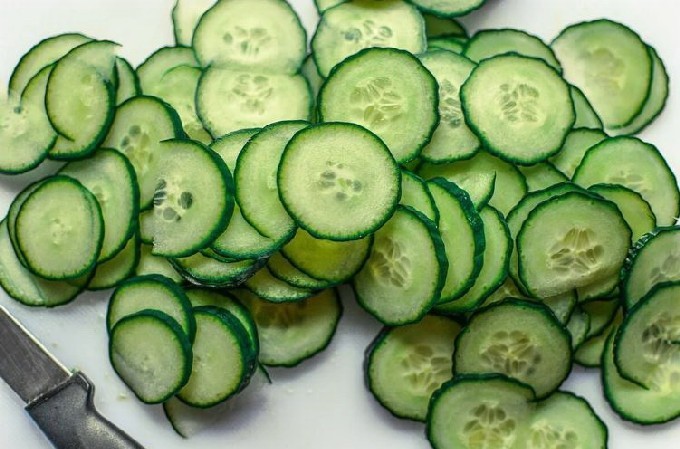 - Snijd de gewassen komkommers in plakjes.