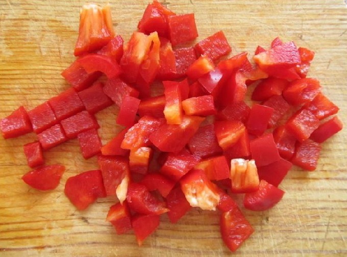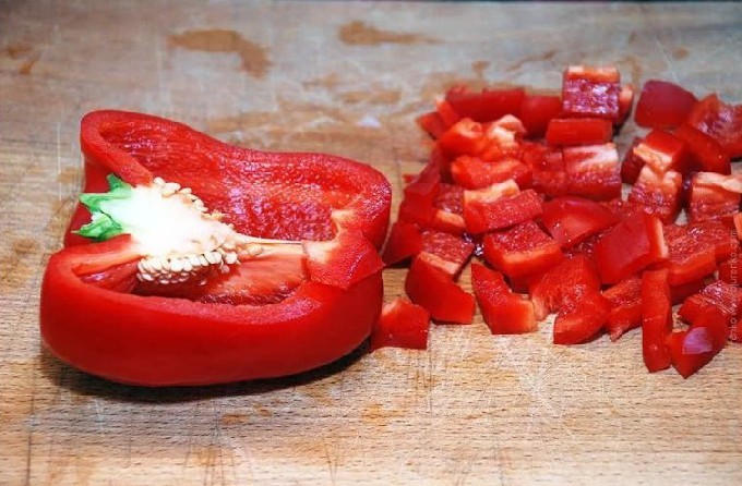 - Verwijder voor paprika's de steeltjes en zaadjes en snijd de paprika's in blokjes. Snijd hete pepers in kleine stukjes (naar smaak).