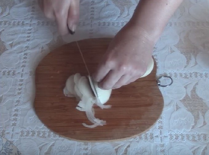 - Snijd de gepelde ui in dunne halve ringen.
