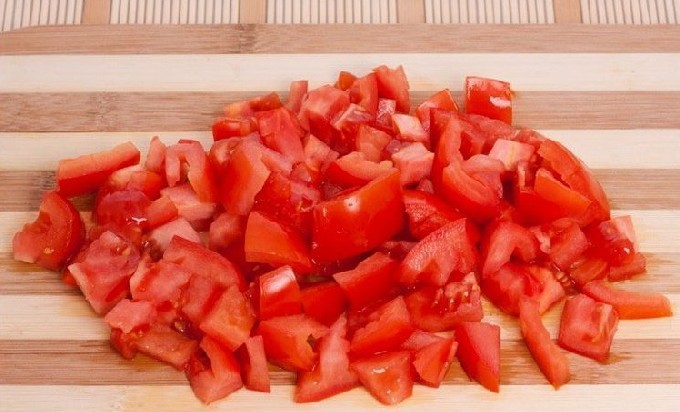 - Spoel alle groenten voor deze salade goed af onder stromend water. Snijd de tomaten in kleine blokjes en doe ze in een pan voor het stoven van lecho.