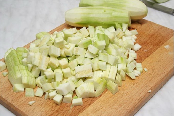 - Schil de courgette en snij ze in blokjes.
