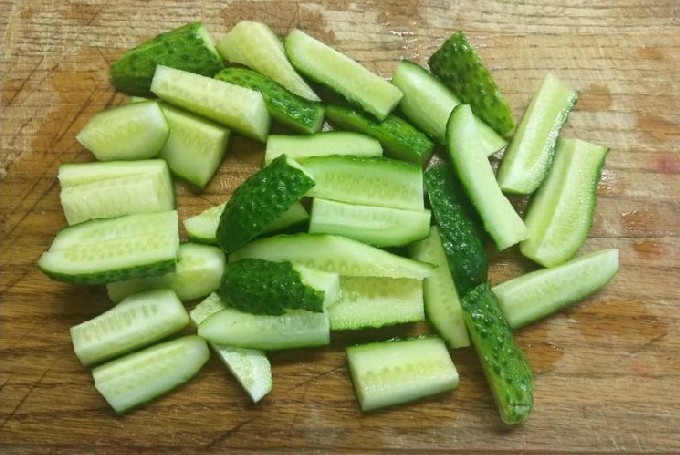 - Snijd de komkommers in willekeurig gevormde stukken: cirkels, stokjes of blokjes.