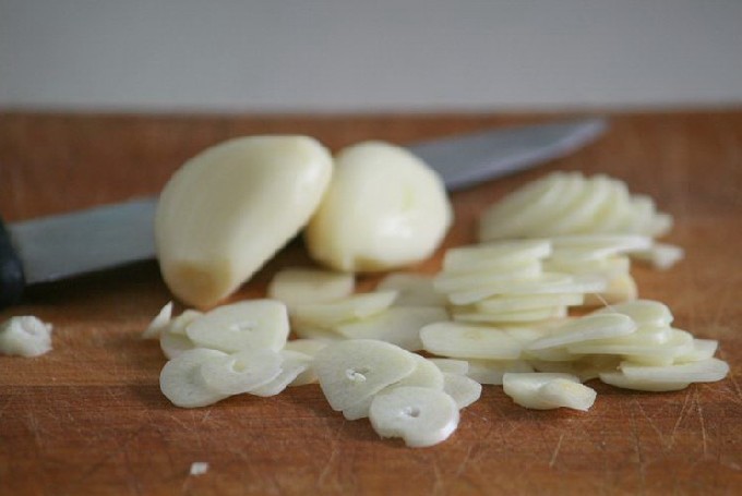 - Pel de knoflook en snij in plakjes.