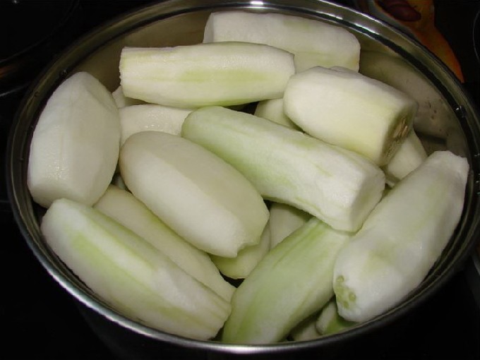 - Was de komkommers, snij de uiteinden aan beide kanten af en snijd de komkommers in blokjes. Leg ze vervolgens in een kookpot.