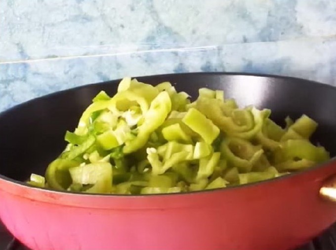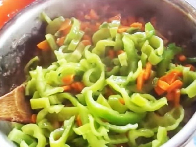 - Verhit plantaardige olie in een koekenpan en bak deze gehakte groenten hierin gedurende 10 minuten. Roer de groenten regelmatig tijdens het frituren om niet te verbranden en de smaak van het gerecht te bederven.