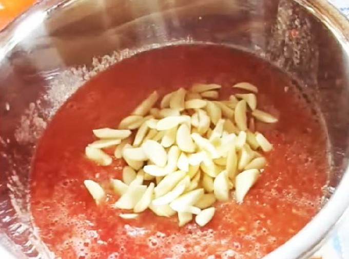 - Zet de kom met tomatenpuree op middelhoog vuur, voeg de benodigde hoeveelheid zout en suiker toe aan de puree en doe de gepelde knoflook in de puree. Je kunt de knoflook in willekeurige stukjes snijden of heel laten.