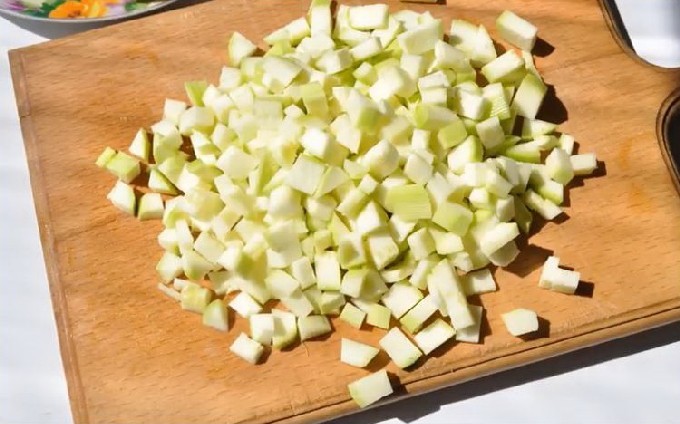- Schil de courgette en snij ook deze in kleine blokjes.