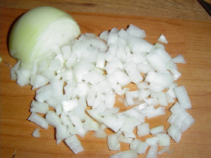 - Hak de gepelde uien fijn.