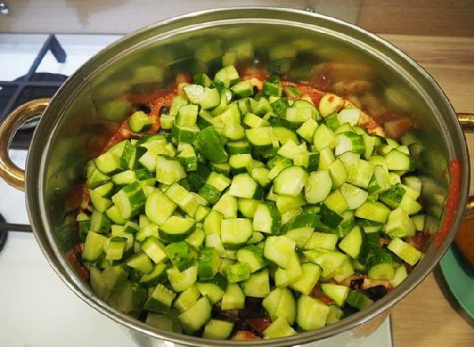- Doe vervolgens gehakte komkommers en uien in een pan, roer goed en laat de lecho nog 10 minuten sudderen.