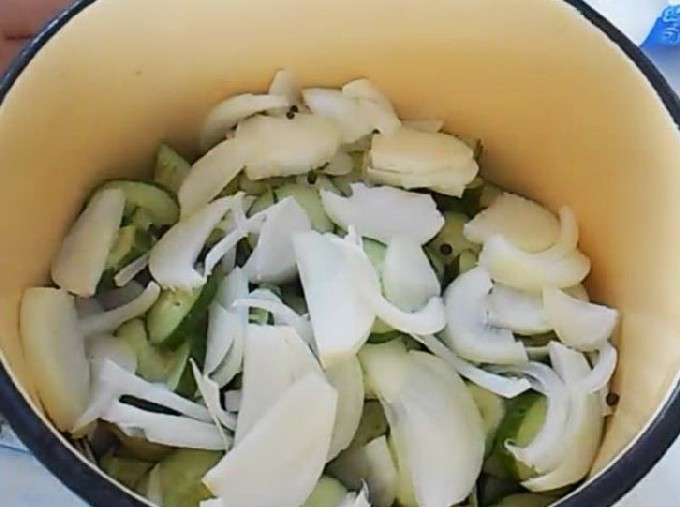 - Pel de uien en snijd ze in dunne halve ringen. Breng de ui vervolgens over naar de komkommers.