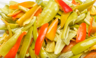 - We maken de paprika's van de stengel schoon, verdelen in verschillende delen en snijden in reepjes. Geef de gepelde en voorgewassen ui de vorm van halve ringen.