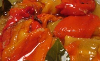 - We nemen een gerecht met een dikke bodem en bereiden een marinade, hiervoor mengen we zout in water met suiker, doen tomatenpuree, azijn 9%, peperkorrels en lavrushka, voegen onmiddellijk plantaardige olie toe, roer voorzichtig tot een gladde massa en kook. Leg de gesneden paprika's in een tomatenmarinade en kook 15 minuten.