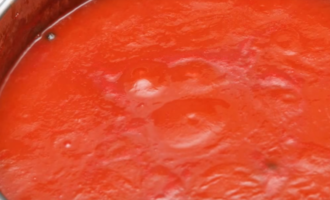 - Meng de tomatenpuree met water en verdun tot een gladde massa in een pan, voeg olie, suiker en zout toe. We zetten de gerechten op een laag vuur tot ze koken en koken 5 minuten.