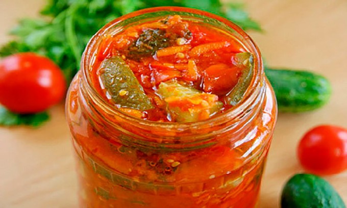 - Alle groenten moeten 30 minuten in één pan koken, zeer fijne knoflook toevoegen, azijn gieten, koken terwijl ze nog 5 minuten koken en uitschakelen.