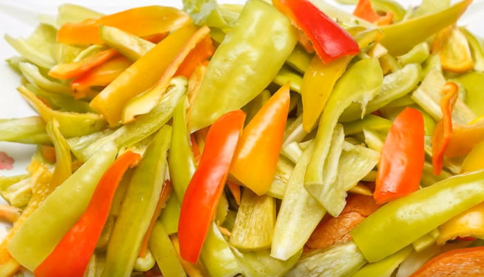 - De sappige peper, die goed gewassen en ontpit is, snijden we in verschillende delen en vermalen deze vervolgens naar jouw smaak: je kunt vierkanten of rietjes gebruiken. We doen het in een plastic zak en wegen het.