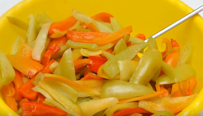 - We wassen de paprika onder stromend water, snijden hem in twee delen en verwijderen de kern samen met de zaden.Doe de in reepjes gesneden paprika in de kokende vloeistof en laat 20 minuten op laag vuur sudderen.