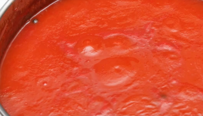 - Meng de tomatenpuree met water en verdun tot een gladde massa in een pan, voeg olie, suiker en zout toe. We zetten de gerechten op een laag vuur tot ze koken en koken 5 minuten.