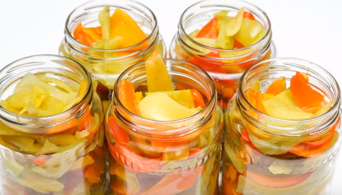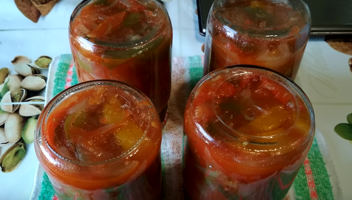 - We leggen de geurige lecho in steriele potten, draaien de deksels vast, bewaren een dag ondersteboven onder een warme handdoek om langzaam af te koelen.