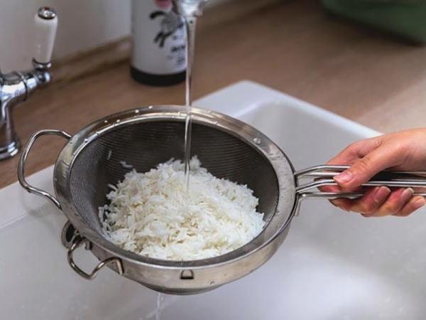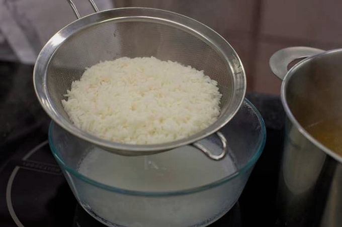 - Zeef de gekookte rijst.
