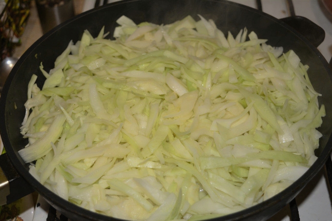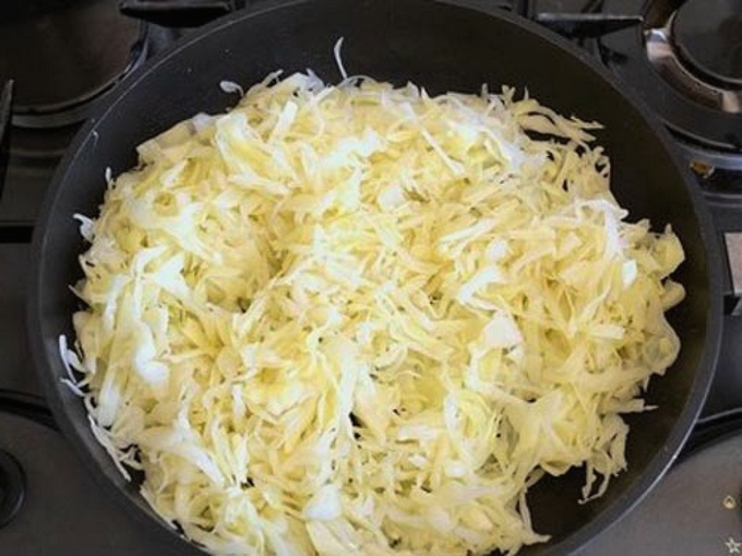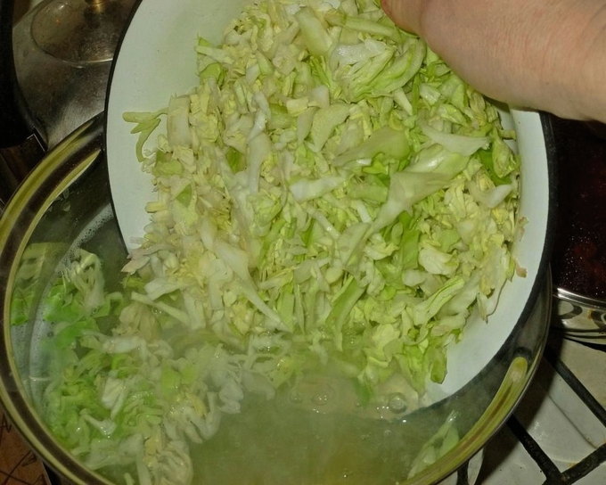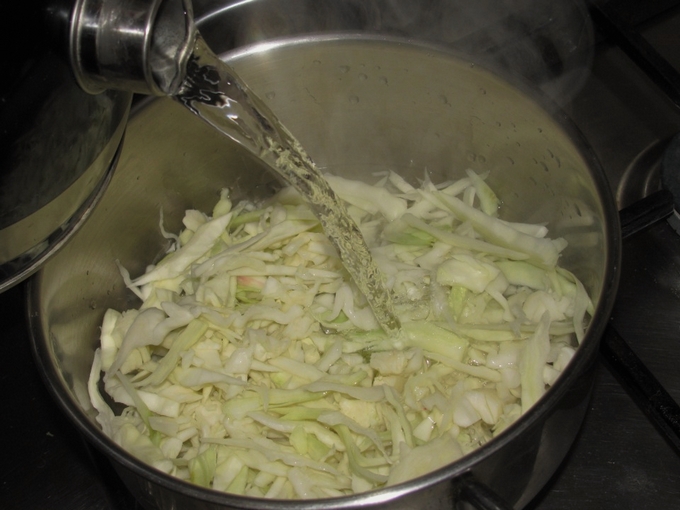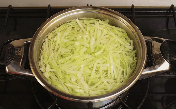 - Kook fijngehakte kool in kokend water gedurende 5-10 minuten, giet het water af.