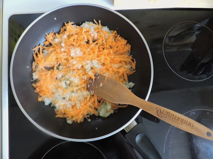 Schil de uien en wortelen, snijd de ui in blokjes en hak de wortelen zeer fijn met een mes of rasp. Bak vervolgens de groenten in een koekenpan in een beetje plantaardige olie tot ze zacht worden.
