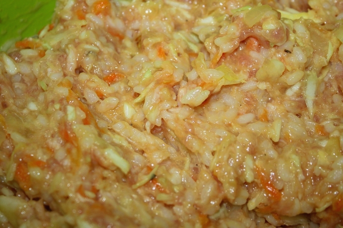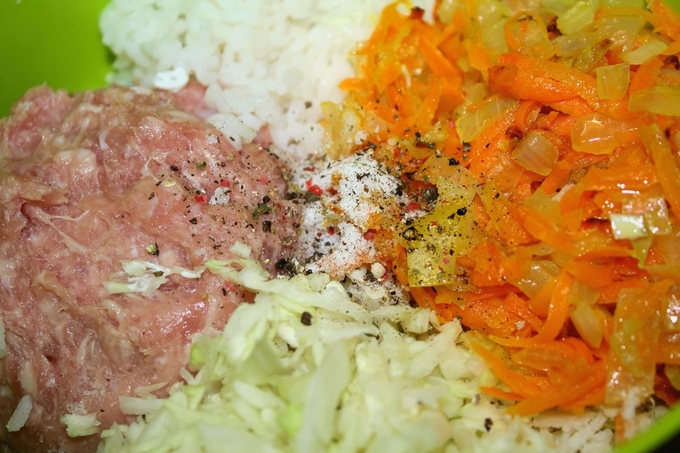 - Meng de gebakken groenten in een kom met gehakt, kool en rijst, voeg zout en kruiden naar smaak toe.